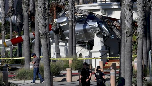 El helicóptero participaba en un evento de recaudación de fondos en Huntington Beach cuando perdió el control y se estrelló entre palmeras, provocando pánico entre los veraneantes.